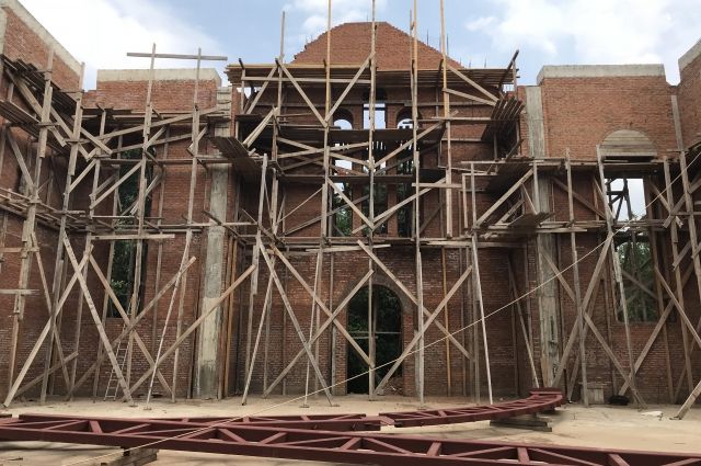 К празднику Успения Пресвятой Богородицы в средней части храма будет наполовину собран металлический каркас крыши. Планируется залить верхнюю площадку второго уровня колокольни и площадку на паперти.